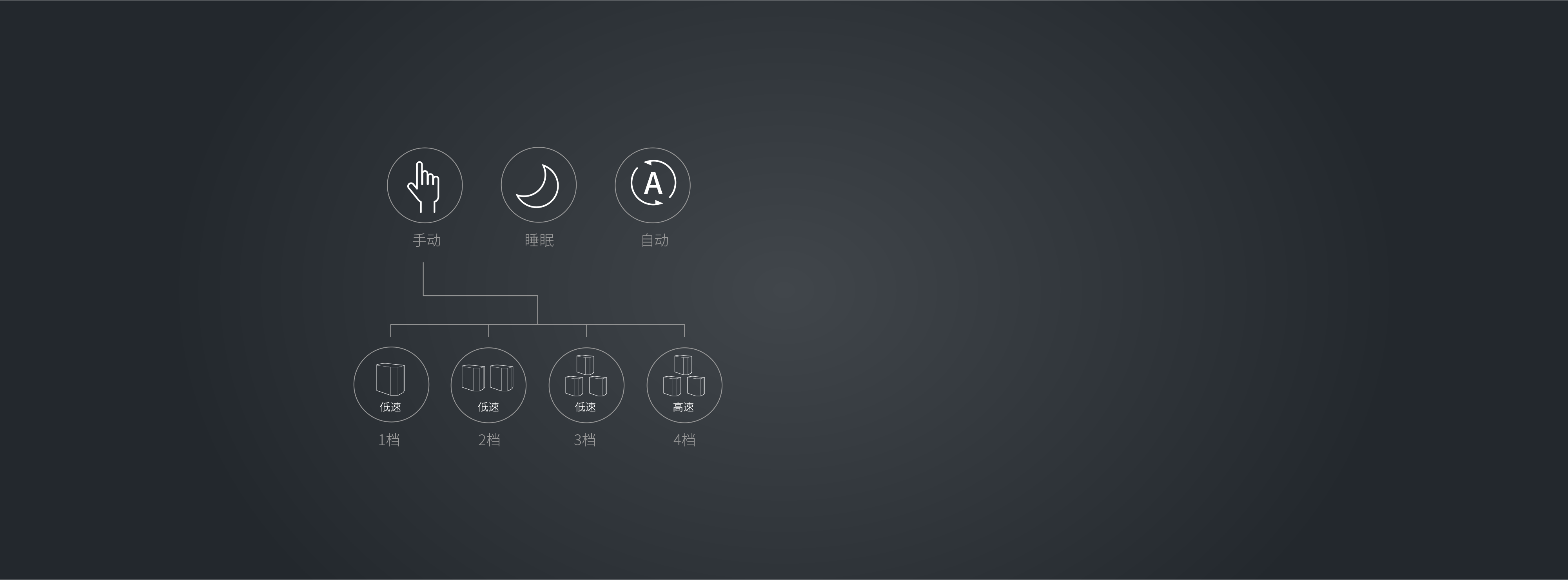 睡眠产品有三种运行模式,分别为手动模式、睡眠模式、自动模式; 手动模式下可手动调节机器风速大档 智能模式下根据室内空气质量自动开启几个模块及自动调节模块的风量档位 睡眠模式下风量为最小档位机器所有显示关闭。